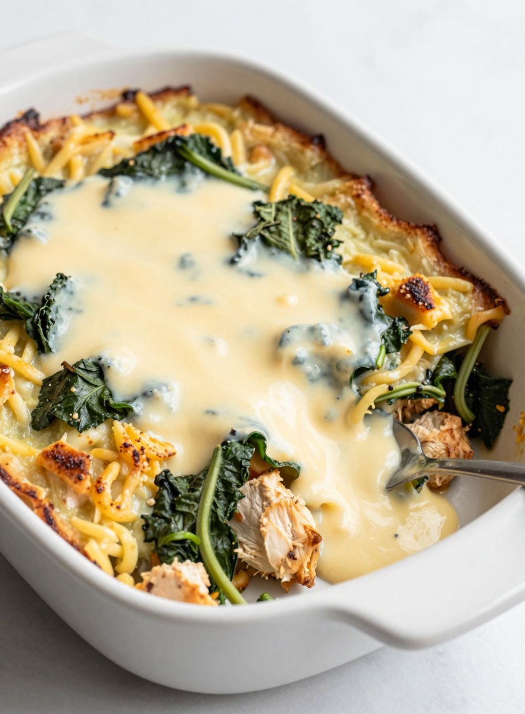 In a large mixing bowl, fold together your shredded chicken, the garlicky spinach, and that glorious cheese sauce. Season generously. Remember: the noodles or chicken will absorb some salt, so don’t be shy with the black pepper!