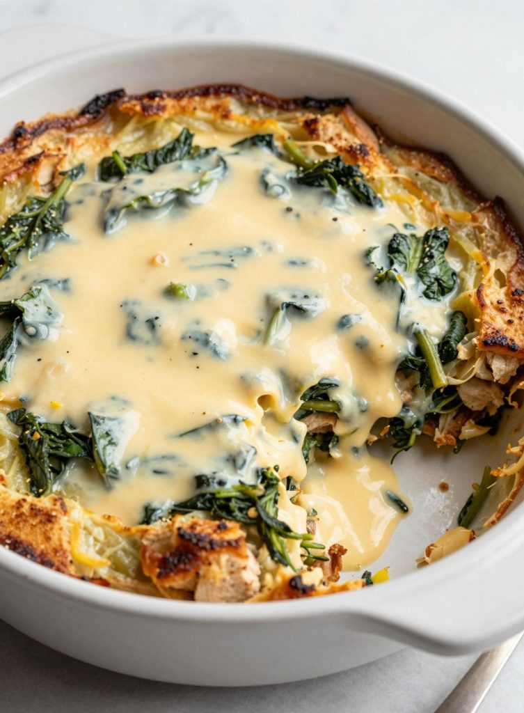In the world of American comfort food, the casserole is king. But too often, they rely on “can-of-soup” shortcuts that leave the dish feeling heavy or one-dimensional. Today, we are elevating this kitchen staple. Our Creamy Chicken Spinach Casserole is built from the ground up with a silky, homemade Mornay sauce, fresh vibrant greens, and a buttery crunch that will have your family racing to the table.